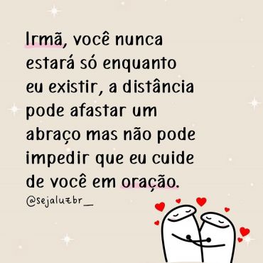 Irmã, você nunca estará só enquanto eu existir, a distância pode afastar um abraço, mas não pode impedir que eu cuide de você em oração.